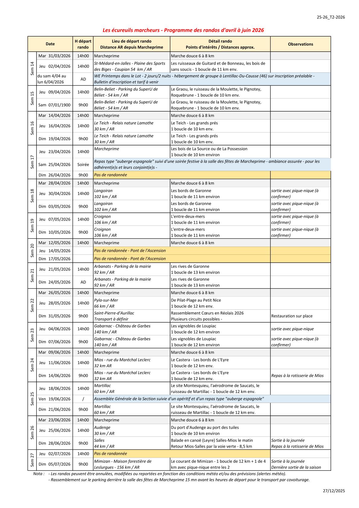Programme des randonnées de avril à fin de saison 2025/2026